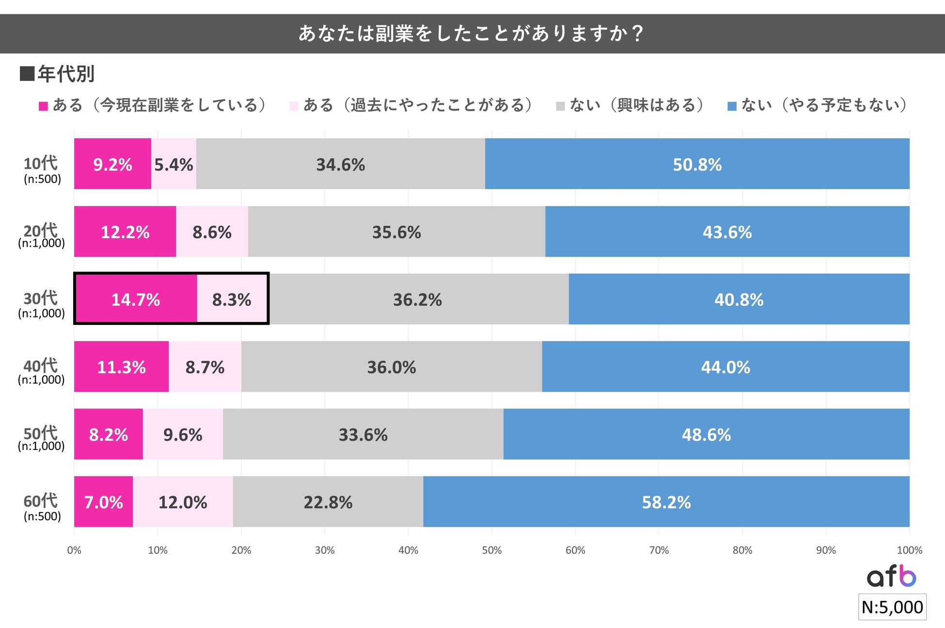 年代別に見ると、20代や30代の若い世代に行くにつれ、副業への関心は高まる傾向にあります。